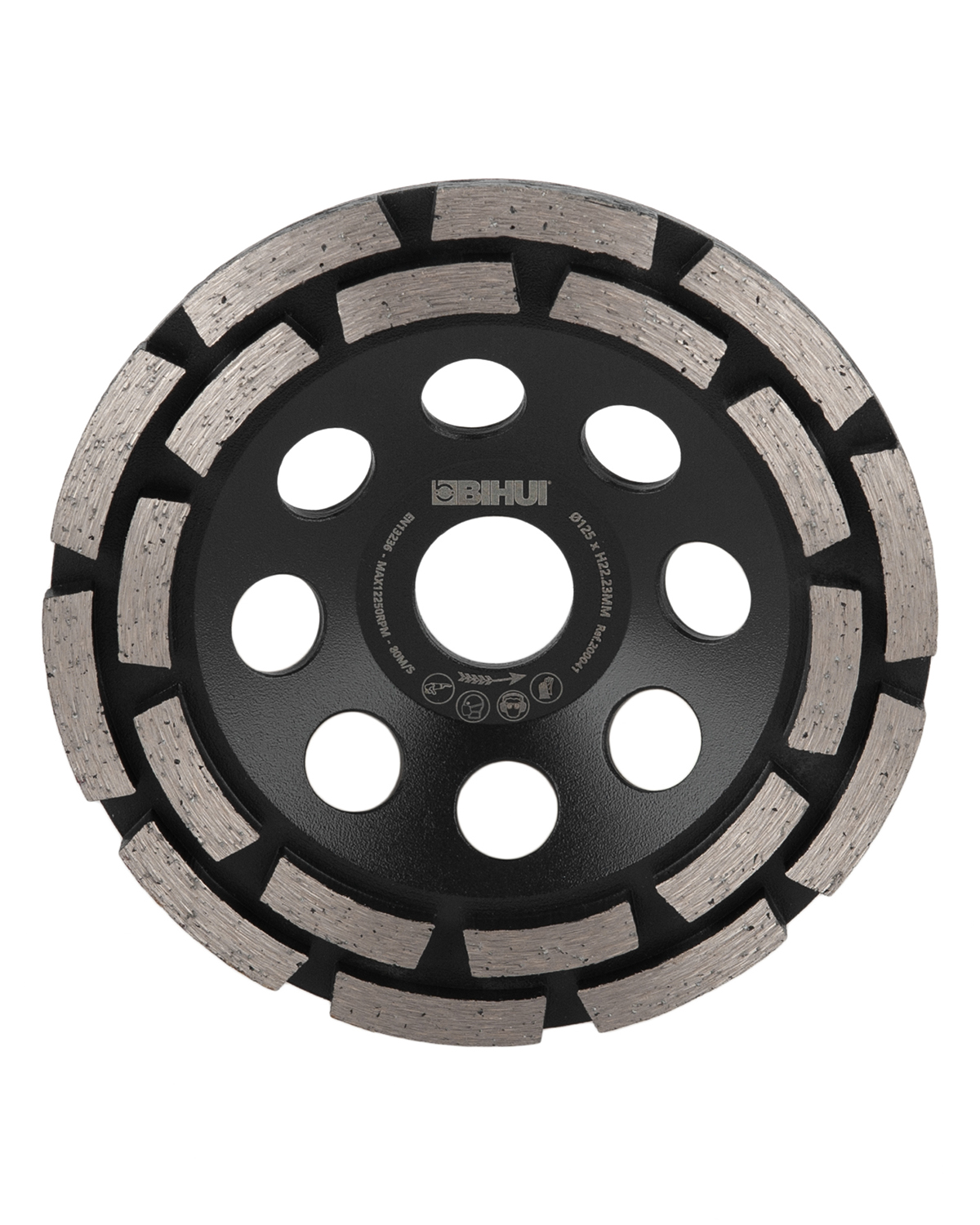 Используя такой инструмент для глубокой шлифовки поверхностей из обычного и армированного бетона, бетонных и армированных поверхностей и снятия наплыва бетона после заливки опалубки. Возможно шлифование бетона любого вида и марок, встречающихся в гражданском применении. Фреза имеет два ряда алмазных сегментов, установленных на легкий металлический корпус. Применяется на ручных углошлифовальных машинах при шлифовании без охлаждения.