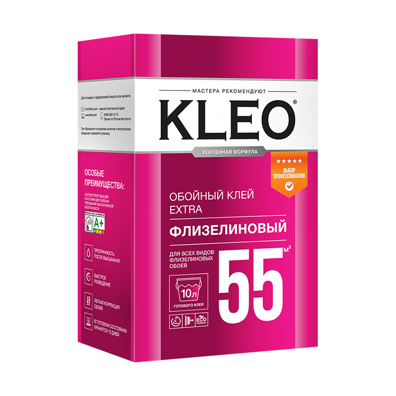 Французский клей KLEO EXTRA 55 предназначен для всех видов флизелиновых обоев, виниловых обоев на флизелиновой основе и малярного флизелина.