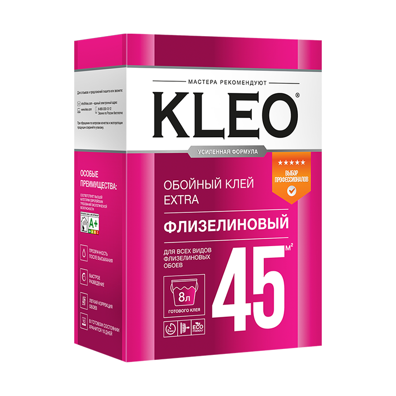 Французский клей KLEO EXTRA 45 предназначен для всех видов флизелиновых обоев, виниловых обоев на флизелиновой основе и малярного флизелина.